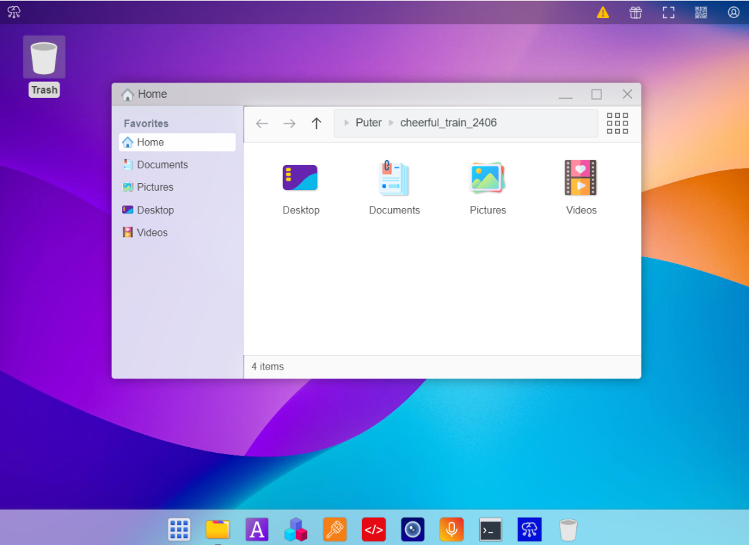 Puter体验下面我们简单体验下功能。Home主页,可查看常用的选项桌面、文件管理、图片、视频等。