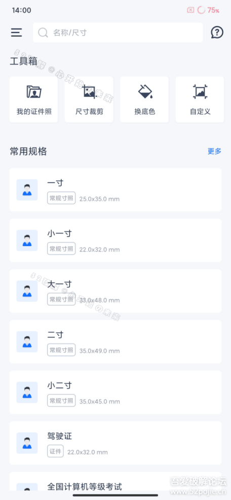 提供一寸、二寸、大一寸、小二寸等常心规证件照寸照尺寸,还包含身份证、驾驶证、社保卡、居住证、护照等常用证件尺寸;会计考试、建造师、教师资格证、法律执业开资格证等资格考试;普通话水平始测试、英语四六级、BEC、TOPIC等语言考试;国家及各省公务员考试の尺寸;新加波、美国、法国等多个国家旅游或工作签证。同时支持自定义尺未寸,只需DIY设置想要的证件照大小或来像素。