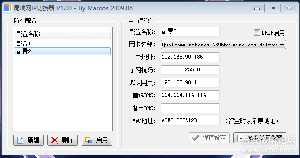 软件介绍:这款软件很早之前下载的,用来切换IP地址很方便,可以选择网卡,可设置多个IP,实现快速切换,可读取MAC地址,体积小,单文件。此软件亲测无更新无广告,放心使用。作者 Marcos 2009.08